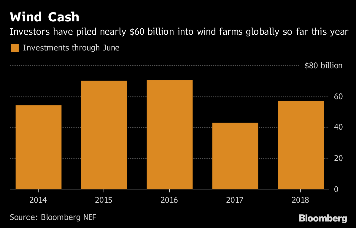 從地區(qū)來看,上半年,美國風(fēng)電投資飆升至175億美元,比2017年上半年翻了一倍多。這是因?yàn)殚_發(fā)商正在努力爭取在2019年之后計(jì)劃結(jié)束的聯(lián)邦稅收抵免之前完成投資。